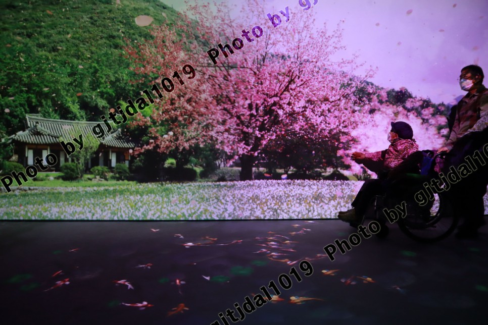 그곳에서 조금 떨어진 전시관에 들어서니 새롭게 단장한 전시관이었다.벽의 그림에 접하면 꽃잎이 퍼지거나 하는 작품으로.