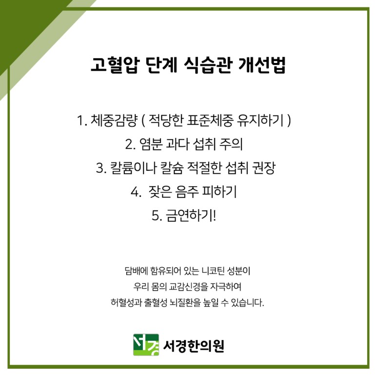 체중감량(적당한 표준 체중 유지) #염분 과다 섭취 주의 #칼륨과 칼슘의 적절한 섭취 권장 # 잦은 음주 회피 #금연에!