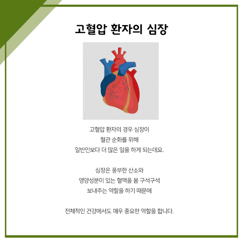 고혈압 환자의 경우 보통 사람보다 혈관 순환을 위해 심장이 더 많습니다.