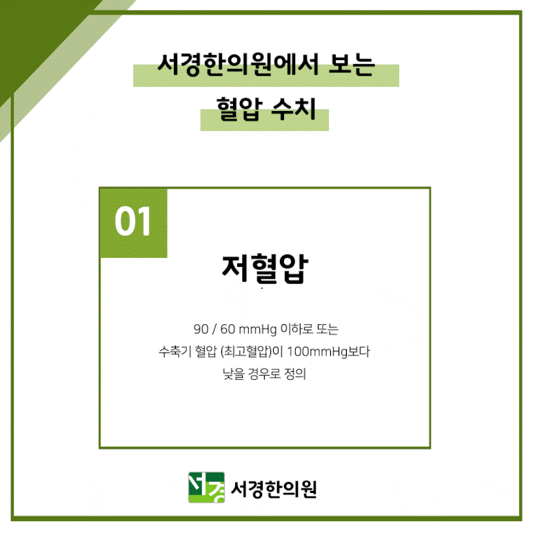 저혈압 90/60mmHg 이하 또는 수축기혈압(최고혈압)이 100mmHg보다 낮은 경우로 정의
