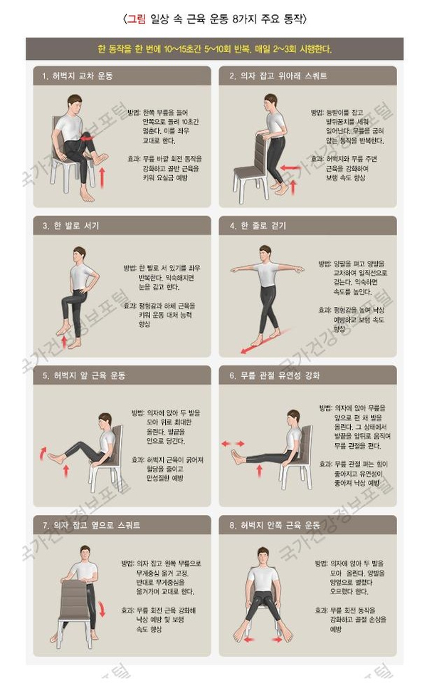 특히 나이가 들수록 유산소운동과 근력운동은 필수죠.운동 강도는 자신이 할 수 있을 정도가 가장 좋습니다. 무조건 30분 이상, 1시간 이상, 걸어 걸어라 등을 정하지 말고 스스로 최대한 걸어 점점 강도를 높여 가면 됩니다.