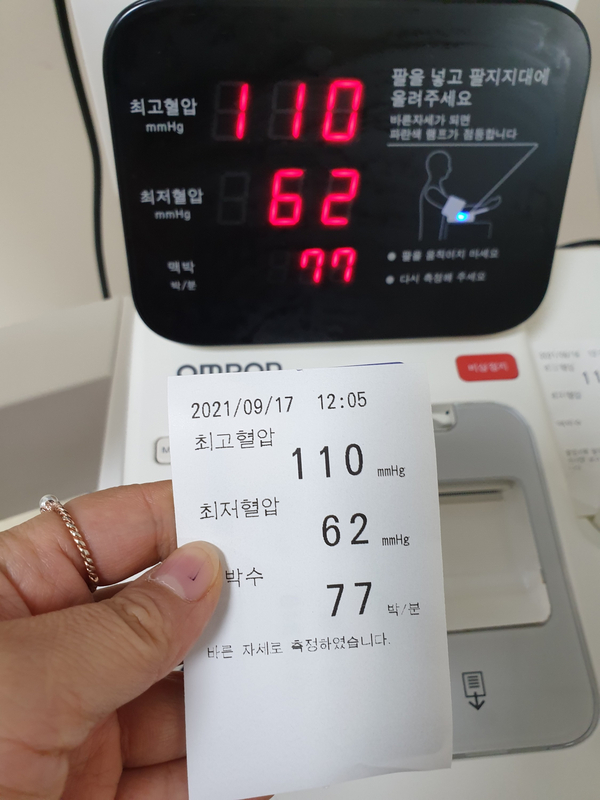 저번에 병원에서 측정한 제 혈압입니다물론 혈압 약을 먹고 있기 때문에 평소에는 120 이하로 유지되는 거예요.그리고 수축기 혈압과 이완기 혈압에 대해 설명을 해 주었습니다.근데 맨 밑에 수치… 그러니까 맥박수는 77이에요정상범위이긴 하지만 실은 빠른 편이에요.