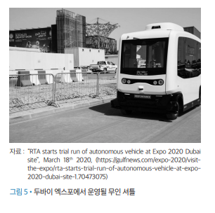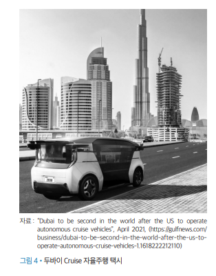 2021년 4월에는 크루즈(Cru ise)자동차를 도입했고 2030년까지 두바이의 모든 택시의 25%까지 자율주행 택시로 대체한다는 계획을 세웠다.7) 관광객들에게 새로운 볼거리로 두바이가 추진하는 관광사업이 탄력을 받을 것으로 기대된다. 2021년 10월부터 열리는 두바이 엑스포에는 정해진 경로를 따라 행사장 입구에서 내부로 연결하는 무인 셔틀이 계획돼 2020년 3월부터 시험 운행 중이다.8)