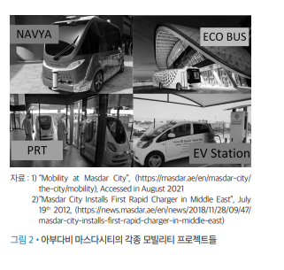 아부다비 현황 아부다비는 지난 10년간 지속가능한 친환경 도시를 추구하며 Zero Waste를 슬로건으로 내걸고 있다. 아부다비의 최대 지주회사인 Mubadala Investment Company가 투자해 개발해온 Masdar City(마스다시티)는 모빌리티 프로젝트의 일환으로 친환경 버스(EcoBus), 전기차(EV) 충전소, Personal Rapid Transit(PRT)를 운영하고 있다.1) 2)