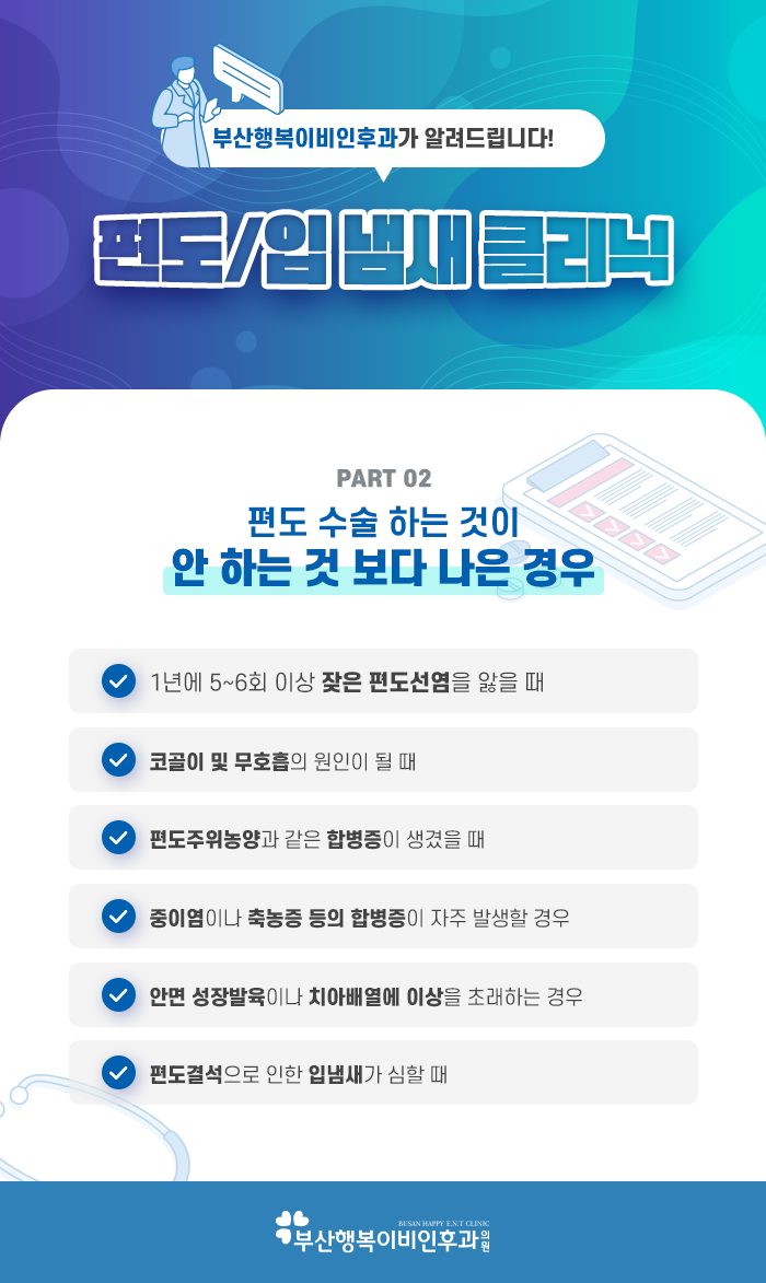 편도 결석 수술 방법은?편도과가 선천적으로 깊어 결석이 발생할 때는 고주파 레이저를 이용해 편도과를 메우는 치료를 할 수 있다.편도선은 그대로 두고 편도선만 채워주기 때문에 통증은 거의 없다. 그러나 만성 편도염이 원인일 때는 금방 재발할 수 있다.재발이 반복될 때는 편도조직을 없애는 PITA 수술을 할 수 있지만 편도피막을 남겨 둬 통증이 적다.그러나 편도염을 자주 겪는 사람에게는 나머지 조직에서 염증이 발생할 수 있어 완전 제거가 가장 효과적이다.편도선을 완전히 제거하는 것이 환자에게 부담스러울 수 있지만 편도선이나 편도염을 극복하는 데 가장 좋은 방법이다.부산행복이비인후과는 점막 손상을 줄이는 bizact를 사용하여 편도를 제거하여 통증도 적고 수술 후에도 쉽게 회복할 수 있다.편도절제는 열에너지를 사용하여 지지하는 방식으로 이루어지지만 bizact는 저온이기 때문에 손상을 최소화할 수 있다.이 밖에도 마취통 전문의가 마취를 하고 편도수술 경험이 풍부한 이비인후과 전문의가 집도하여 안전에 주의를 기울이고 있어 원활한 편도절제술을 받을 수 있다.