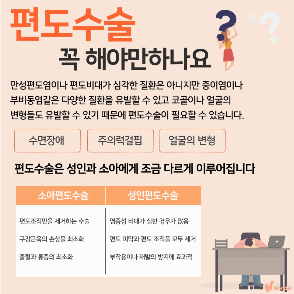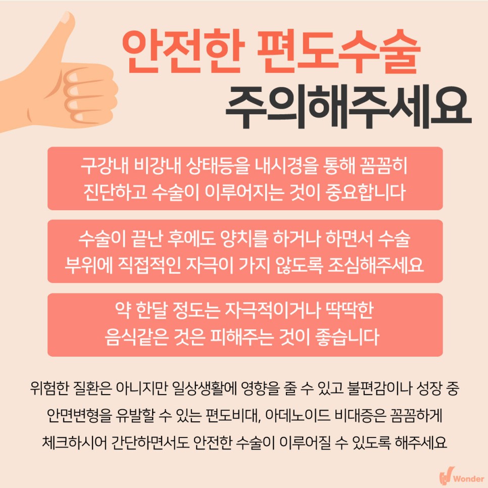위험한 질환과 수술은 아니지만 일상생활에 영향을 미치고 불편함이나 성장 중 안면변형을 유발하는 편도비대, 아데노이드비대증은 수술을 통해 제거하는 것은 좋지만 비교적 간단한 수술인 편도수술도 세심한 진료와 섬세한 수술, 사후관리가 제대로 이루어지지 않으면 각종 합병증과 부작용을 유발할 수 있는 만큼 꼼꼼하게 체크하여 쉽고 안전한 수술이 이루어지도록 하세요!