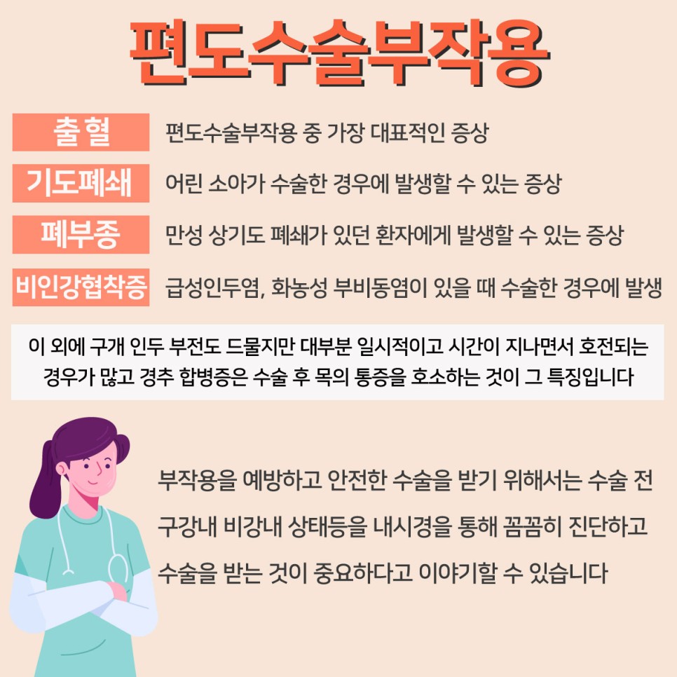 이 밖에 구개인두부전도 드물지만 대부분 일시적이고 시간이 지날수록 호전되는 경우가 많으며 경추합병증은 수술 후 목의 통증을 호소하는 것이 특징입니다.