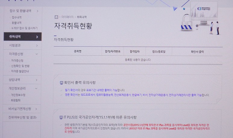 자격취득현황이라는 페이지가 뜨면 대한상공회의소에서 워드프로세서 자격증을 취득하면 종목명과 합격자격번호, 합격일자 등의 정보가 나옵니다. 확인서 출력은 한글, 영문 두 가지로 가능합니다.