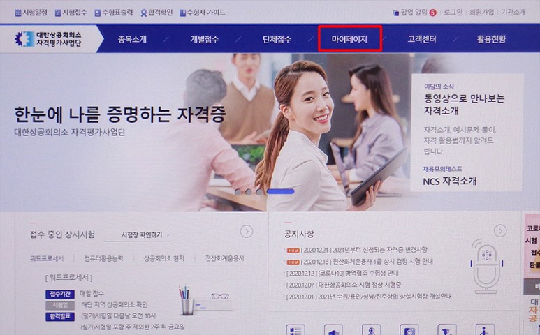 먼저 해당 자격증은 대한상공회의소에서 주관하는 것으로 자격평가사업단 홈페이지를 방문하시면 됩니다. 안내드린 링크에서 확인하실 수 있습니다. 접속 시 상단의 메뉴 중 마이페이지를 클릭하여 들어갑니다.