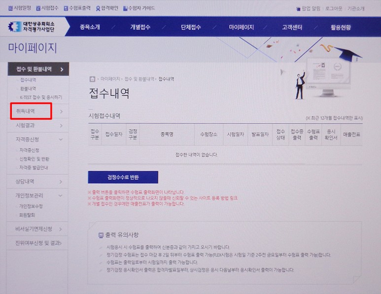 마이페이지로 들어오시면 가장 먼저 접수내용을 확인하실 수 있습니다. 우리는 얻은 것의 정보를 보러 왔기 때문에 왼쪽에 있는 취득 내역을 클릭합니다.