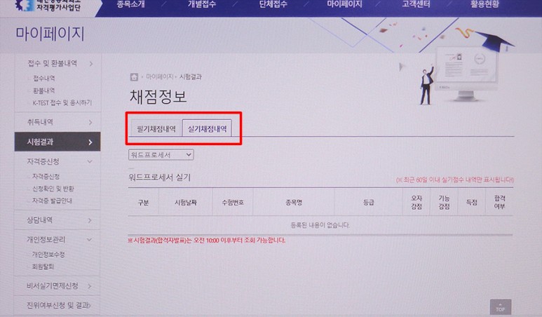 시험을 보았는데 결과가 궁금하면 일정이 될 때 시험 결과에 들어가서 필기와 실기 채점 내역을 보세요 날짜와수험번호,감점사항,득점,합격여부등이있으니체크해주세요.