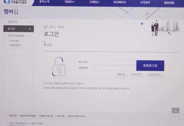 당연히 계정으로 로그인 해야 되는데요. 이름이나 기타 개인정보를 이용해서 자격증 시험을 봤을 때 기입한 내용을 바탕으로 조회할 수는 없는 것 같고 아이디에 넣어주세요.