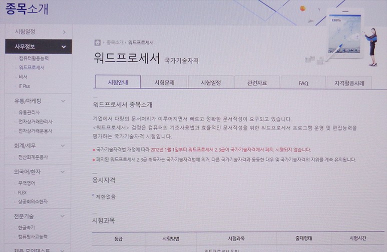 워드프로세서는 국가기술자격으로 기업에서 다량의 문서처리를 원활하게 할 수 있는 능력을 평가하기 위해 만들어졌다고 합니다. 2012년 1월 1일부터는 2,3급 폐지되어 시행되지 않고 1급만 운영하게 됩니다.