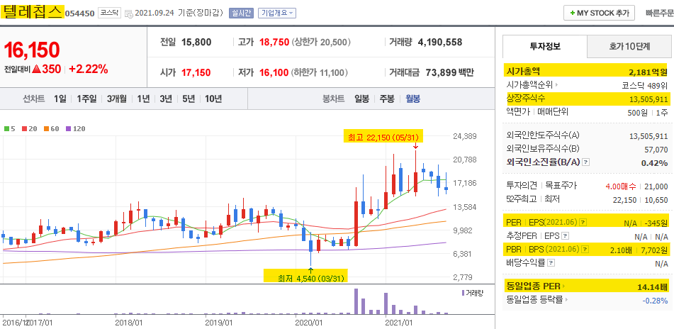 최근 시가총액은 약 2,100억원이며 발행주식수는 약 1350만 주에 이른다.
