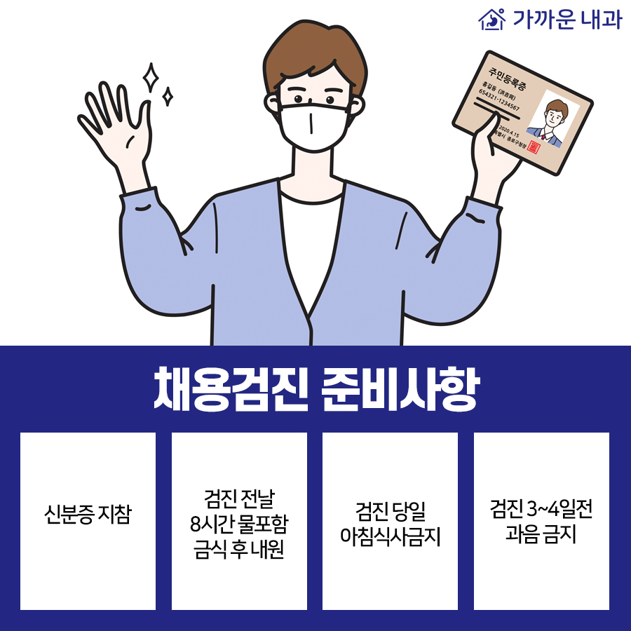 채용검진을 하기 전에 준비물로는 일반 채용검진을 하기 전에는 신분증과 8시간 이상의 공복을 유지해야 하며, 공무원 채용검진은 신분증과 8시간 이상의 공복, 그리고 반명함의 사진 2장이 필요합니다.