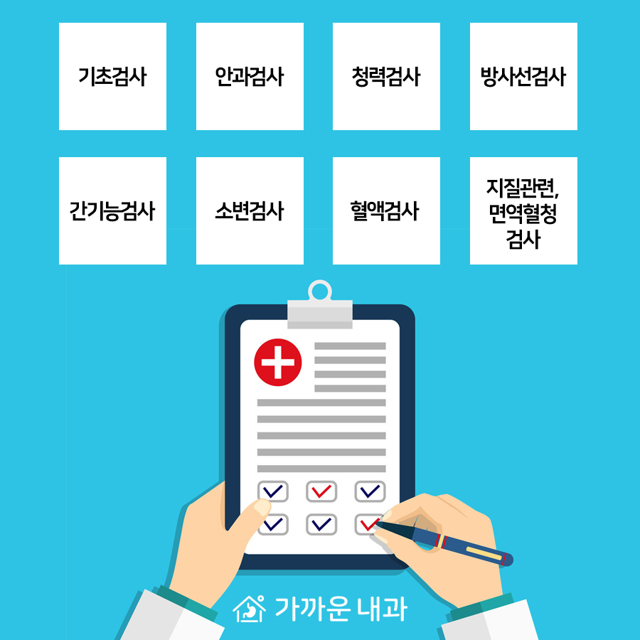 그리고 일단 기초적인 신체를 측정하고 키, 몸무게, 청력, 시력, 색신, 가슴둘레, 혈압을 측정합니다.그 다음으로 소변 ph와 소변 단백, 요잠혈, 요당을 검사할 수 있는 소변검사를 실시하고 있으며, 3번째는 혈당, 고지혈증, 간기능, 빈혈, b형 간염 항원, 항체, 성병검사를 할 수 있는 혈액검사와, 4번째는 흉부 x선검사로 결핵검사를 실시하고 있습니다.마지막으로 전체적인 검진 결과를 토대로 전문의를 면담하고 있으며, 시력과 청력은 안경과 보청기를 사용하여 보정시력, 청력으로 검진을 받을 수 있습니다.그리고 악성 고혈압은 결격 사유이므로 혈압이 있는 분은 금식을 하겠지만 혈압약은 복용하십시오.또한 교사나 교육공무원의 경우 잠복결핵검사가 요구될 수 있으니 유의하세요!