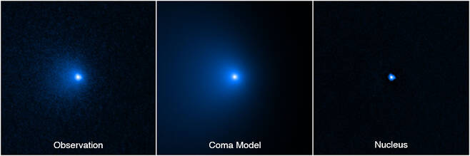 혜성 C/2014 UN271의 허블우주망원경 관측 이미지와 팽이를 제거한 핵 이미지.(사진=NASA) 이후 연구팀은 1월 8일 허블망원경을 이용해 태양에서 약 32억 km 떨어진 곳에 있는 이 혜성을 관측해 사진 5장을 찍었다. 가시광 이미지만으로는 핵을 들여다볼 수 없고 핵이 있는 장소에서 빛이 증가한 자료를 활용했다. 핵 주변 팽이에서 발생하는 빛을 컴퓨터 모델을 이용해 제거하고 칠레 북부 사막에 있는 ‘알마'(ALMA) 망원경으로 관측한 전파 자료와 합쳐 결과를 얻었다.주잇 교수는 “이 혜성은 먼 거리에서도 매우 밝고 핵이 크다고 생각해 왔는데 드디어 확인할 수 있었다. 오르트 구름에서 100만 년 넘게 태양을 향해 다가가고 있지만 같은 시간에 다시 돌아올 것이라고 덧붙였다.한편 혜성은 타원 혹은 포물선 궤도에서 정기적으로 태양 주위를 도는 작은 천체이다. 혜성은 바위(돌) 등으로 구성된 소행성과 달리 얼음과 먼지로 이루어져 있다. 이 때문에 혜성이 태양에 가깝게 접근하면 내부 성분이 녹아 녹색 등으로 빛나는 꼬리를 남긴다.