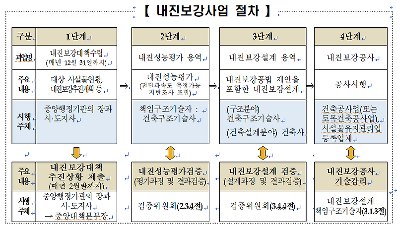 第16條 (기존 시설물의 내진보강 추진 등)①관계 중앙행정기관의 장 및 시·도지사 등은 기본계획에 따라 소관 시설물에 대한 내진보강대책을 수립하여 추진하고, 그 추진상황 등을 행정안전부장관에게 통지하거나 보고하여야 한다.지진 대책법 내진 성능 평가 보고서