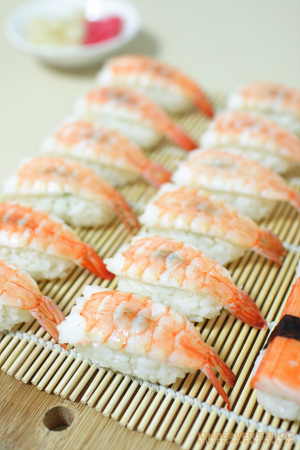 초밥 재료 준비: 계란, 새우, 가리비, 당근, 가지, 아스파라거스