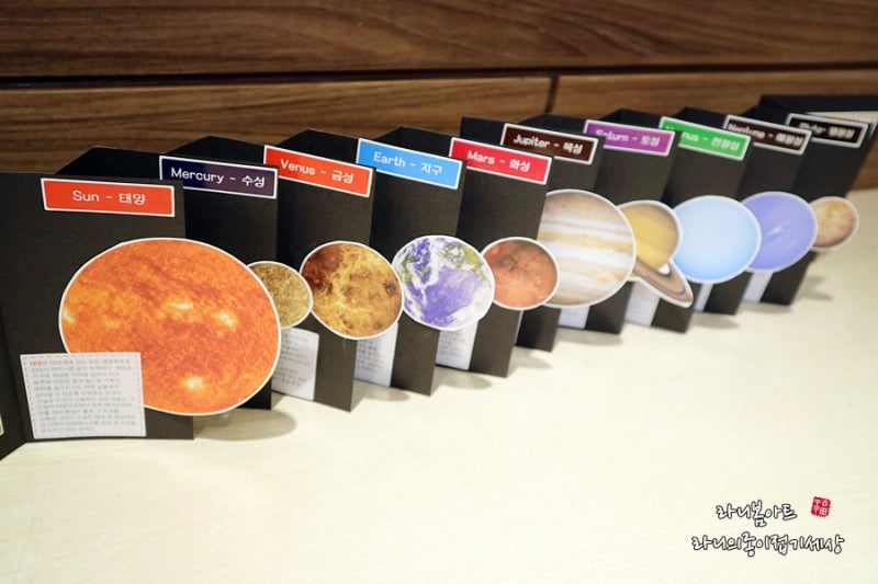 최종적으로 완성된 우리 태양계 행성은 우리가 알고 있는 기존 행성의 색깔과는 매우 달라 아이가 하고 싶은 대로 색을 칠해 완성했다.우리만의 태양계가 된 것이다.