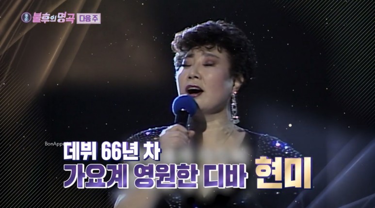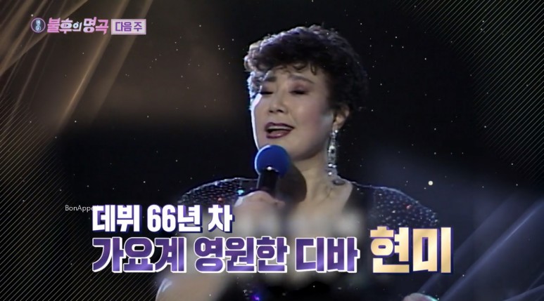 불후의 명곡에서는 역사의 산증인이자 대체 불가능한 디바인현미, 임희숙, 정훈희, 최진희, 이자영의 거침없는 토크와 역대급 무대를 만날 수 있습니다. 전설의 디바가 왜 전설인지 확인할 수 있는 뜨거운 감동과 전율의 무대가 펼쳐진다고 해요. 가수 현미 나이 85세