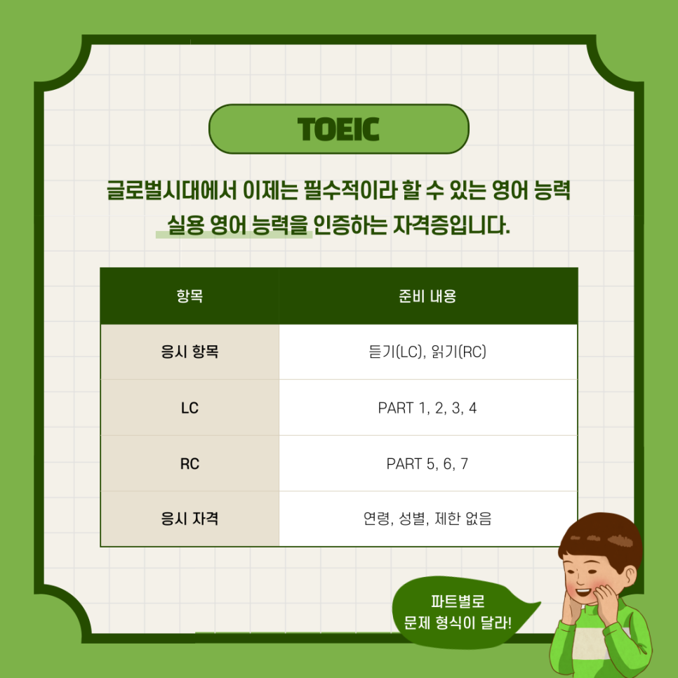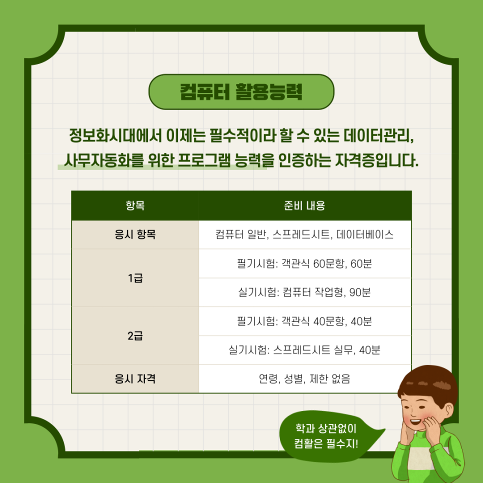 하지만 어디까지나 ‘추천’ 자격증이므로 정확하게 본인이 원하는 기업에서 어떤 자격증을 원하는지, 취업에 가산점이 붙는지, 본인이 취득했을 때 도움이 되는 자격증은 무엇인지 확인하는 것이 좋습니다.