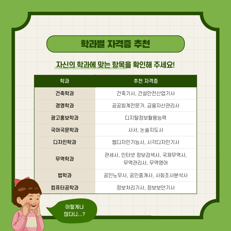 그런데 학과별, 직렬별로 요구되는 자격증이 다른데 도대체 어떤걸 준비해야 하는지 걱정하시는 분들이 많으시죠?