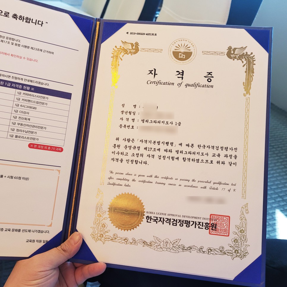 캘리그라피 자격증은 민간자격증이기 때문에 공신력이 중요했습니다즉, 많은 사람들이 취득하는 교육기관인지 확인하는 것도 중요하고, 자격증에 등록번호가 있는지도 꼼꼼하게 확인해야 했습니다.