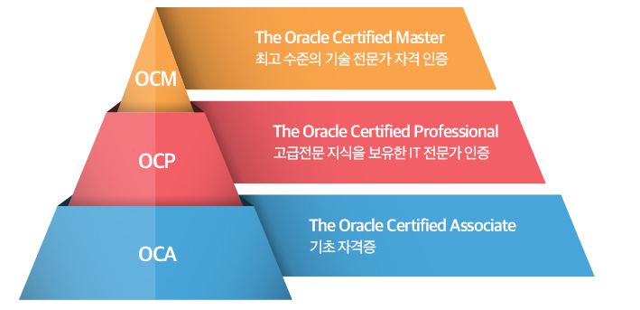 ⇒ OCA 기초자격증으로 대부분의 기업이 인정하지 않아 취득 X OCP 고급자격증으로 한국에서 취득할 수 있는 최고 수준의 자격증, 실무자/취업준비생이 가장 많이 준비하는 자격증 OCM 최고 수준의 기술전문가 자격, 한국에서 취득할 수 없다.