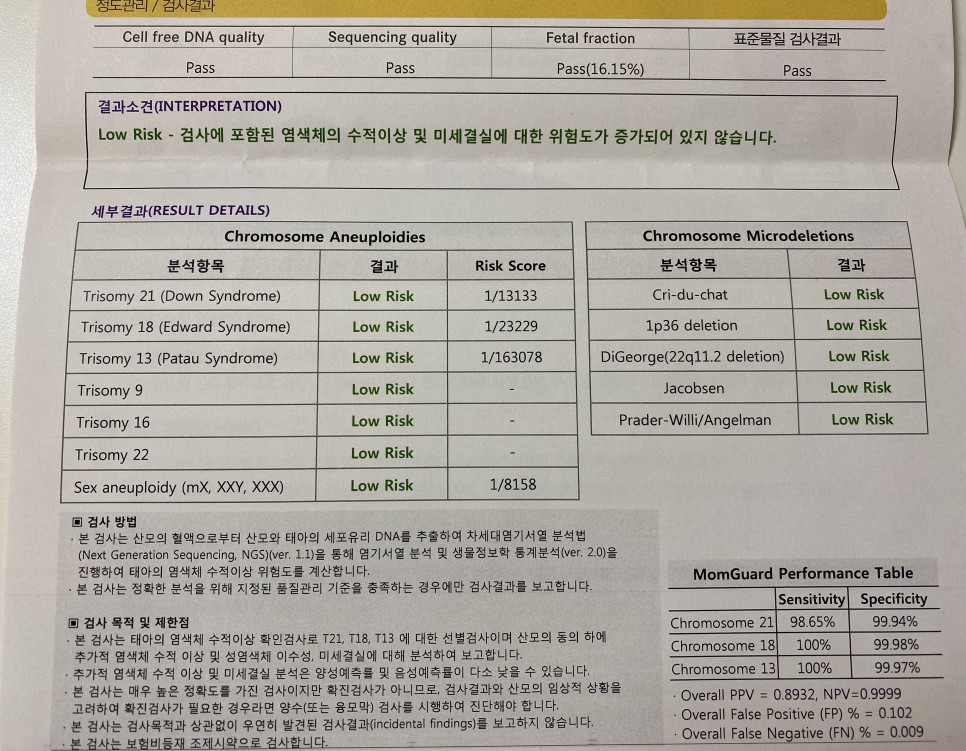 니프티 검사지는 정말 큰일 없어.60만원이나 내고 한 검사인데 이 결과지 한 장이 전부! 그래도 99% Low Risk라고 하니 마음은 편하다. 남편은 편한 게 가장 중요하다고 잘했다고 한다.