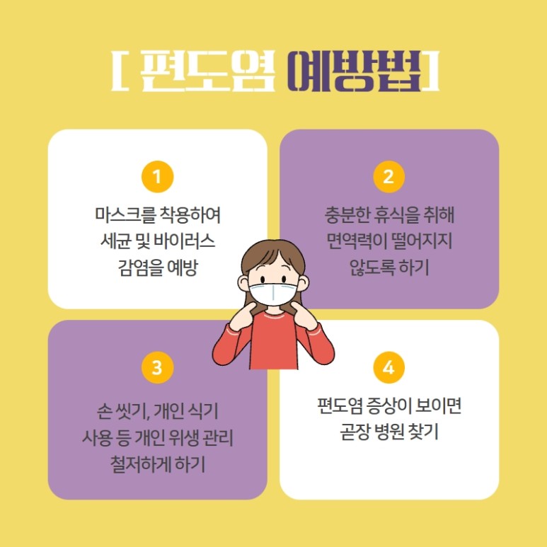 “편도염 예방법 및 관리법” 마스크 착용 코로나로 인해 마스크를 착용하는 것이 일상화되고 있으나, 편도염 예방을 위해서도 마스크 착용은 필수입니다. 마스크를 착용함으로써 세균이나 바이러스에 감염될 확률을 줄이고, 목의 건조도 적기 때문입니다.충분한 휴식 편도염은 면역력이 저하되었을 때 주로 발생하기 때문에 평소 면역력이 떨어지지 않도록 충분히 휴식을 취하고 건강에 도움이 되는 음식을 섭취하는 것이 중요합니다.개인위생관리인에 의한 감염을 방지하고 면역력 저하를 막기 위해서는 손을 항상 자주 씻고 음식이나 식기 등 개인용품을 공유하지 않도록 주의해야 합니다.위와 같은 편도염 예방법을 지켜 건강하게 겨울나시길 바랍니다.