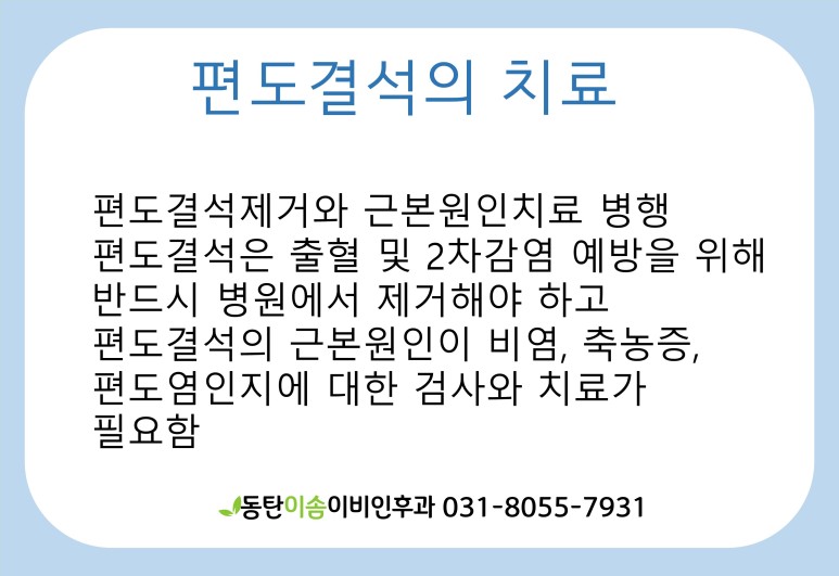 치료방법 편도결석 치료는 편도결석 제거와 근본원인 치료로 진행되어야 합니다. 편도결석을 제거하기 위해서는 흡입기를 통한 결석제거가 필요합니다. 육안으로 확인할 수 있을 정도로 큰 결석을 손이나 면봉으로 자가 제거할 경우 출혈이나 2차 감염 위험이 있으므로 반드시 이비인후과를 방문하여 안전하게 제거하시기 바랍니다.