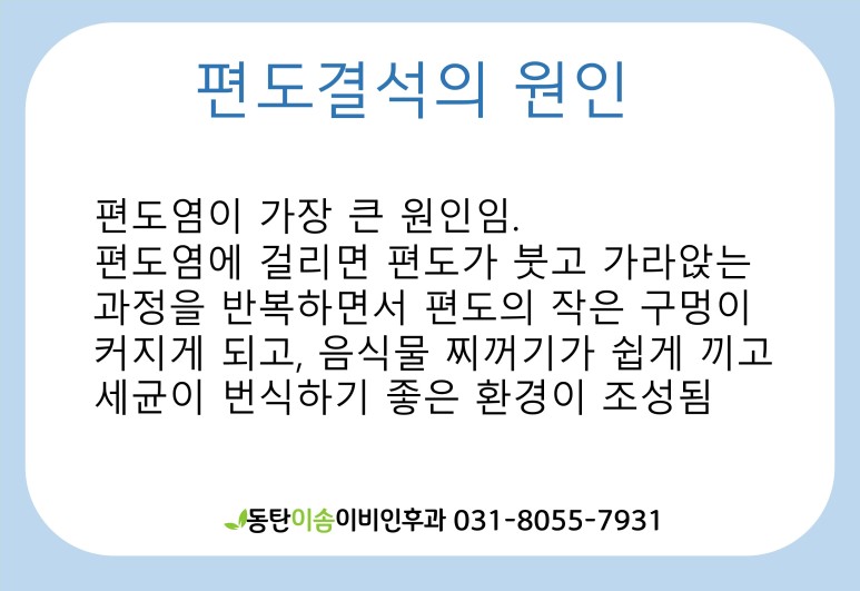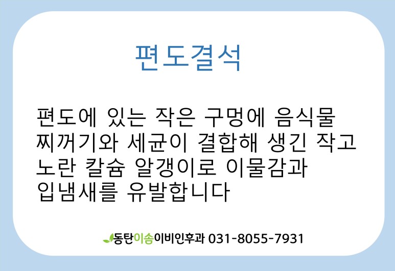편도결석의 원인 편도염에 걸리면 편도선이 붓고 가라앉는 과정을 반복하면서 ‘편도선’이라는 편도선의 작은 구멍이 커집니다. 구멍이 커지면 음식물 찌꺼기가 쉽게 생겨 세균이 번식하기 좋은 환경이 조성되고 편도결석에 걸릴 확률이 높아집니다. 세균이 번식하여 휘발성 황화물이 생성되어 입냄새의 원인이 됩니다.또한 비염이나 축농증(부비강염)으로 인해 콧물이 뒤로 넘어간 후 비루증상이 있는 환자의 경우 편도에 세균이 증식하기 쉬운 환경이어서 편도결석이 자주 생깁니다.