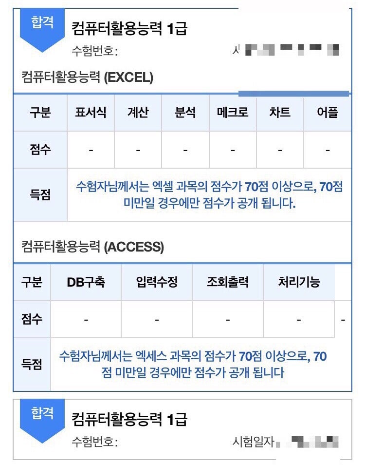 따라서 이 세 부분에 속하는 개념을 중심으로 공부한다면 적어도 세 영역에서 총 60점 이상을 확보하는 데 큰 무리가 없을 것이다.곰팔 1급 필기합격 칩은 결국 선개념 후 기출순으로 접근하는 것이 좋다. 이때 비중은 이론 3:기출문제 7로 하는 것이 좋으나 이론 자체가 시험문제 해결을 위한 지식을 빨리 쌓기 위한 목적이 필요하다. 대신 개념을 확실히 배웠다면 기출문제 푸는 방법을 점차 늘려갈 것을 권하고, 공활필기시험은 기출순환식이기 때문에 과거에 나왔던 문제들이 반복해서 출제되는 부분이 존재한다. 따라서 내가 보는 시험에서 문제풀이 학습 때 익힌 질문이 출제될 가능성이 높다. 그래서 이론은 간단하게 시험문제를 풀 수 있을 정도로 공부하고, 10개년 치 기출을 집중적으로 풀고 오답을 정리하는 과정을 반드시 소화하자!그러면 그보다 더 어려운 1급 공팔실기는 어떻게 준비하면 좋을까요? 우선 해당 등급 실기시험은 엑셀과 접근성을 갖고 직접 문제를 푸는 시험제도로 구성돼 있는데 필기와 마찬가지로 고득점을 받을 수 있는 영역이 정해져 있는 것이 특징이다.컴퓨터활용능력 1급 실기합격칩도 필기와 마찬가지로 실기과목에서 배점이 높은 부분을 집중적으로 연습하는 것이 중요하다.실기에서 점수배점이 높은 영역1]엑셀:계산작업(함수)30점, 기타작업(매크로,차트,프로시저)35점,분석작업20점2]접근:DB구축30점,처리기능실장25점,입력및수정기능실장25점해당 부문 점수를 더할 경우에는 엑셀 과목에서 85점, 접속 과목에서도 85점을 받을 수 있다. 그럼 좀 더 구체적으로 컴퓨터 활용 능력 1급 실기 시험 합격 팁을 살펴보면 ‘1) 실기 문제 풀이 시간 관리 2) 배점 높은 것부터 풀기’를 명심하자! 실기 시험의 특징은 첫 번째 파트가 단순한 기본 작업으로 되어 있기 때문에 이 부분은 기계적으로 반복해서 풀면 대개 틀리지 않기 때문에 시간만 잘 관리하면 기본 점수를 받을 수 있다. 반면 스프레드시트 과목 함수, 데이터베이스 과목 DB 구축은 어렵고 문제도 어렵다. 그래서 이 부분에서 푸는 시간과 정확성이 관리되지 않으면 상당히 어려워진다.따라서 곰팔 1급 실기 합격 칩은 엑셀에서 중요하게 여기는 함수, 데이터베이스 실무의 최초 평가 영역인 DB 구축에 대해 문제 해결 단계부터 신경 쓰는 것이 중요하다. 그러기 위해서는 시험공부를 할 때 시험에 역대 6회 이상 출제된 함수와 기능을 꼼꼼히 보는 것이 좋다. 참고로 공활 1급 실기시험에서 6회 이상 출제된 함수문제에는 YEAR, NOW, IF, IFERROR, DSUM, SUMIF 등이 있으며, 주로 출제되었던 데이터베이스 구축문제 유형으로는 인덱스 설정, 유효성 검사규칙, 엑셀 파일을 테이블 형식으로 가져오는 것 등이 있다.실기시험 합격 팁을 최종 정리해 보면 이 역시 필기와 마찬가지로 푸는 방법을 정확히 숙지한 뒤 시간 관리를 하면서 기출문제와 자주 출제되는 함수 등을 반복 숙달로 익히는 것이 좋다. 물론 처음에는 시간을 맞추기 힘들 수 있지만 공부 기간을 한 달로 잡고 간단한 난이도와 복잡하지 않은 함수식부터 차근차근 마스터해보는 것이 좋다.컴퓨터 활동 자격 시험은 시험 일정이 따로 정해져 있지 않다. 즉 컴퓨터활용능력 1급 시험은 필기와 실기가 모두 상설 검정으로 수험생 자유롭게 공부기간을 정할 수 있다. 따라서 개설일로부터 4일 이내에 접수를 완료하면 수험생들이 편한 지역에서 공부할 수 있도록 시험장도 마음껏 고를 수 있다. 이런 점도 참고해서 공부하길 바라며, 모두가 어려워하는 실기까지 최대한 빨리 취득할 수 있기를 바란다. 다들 파이팅! 컴퓨터활용능력자격정보2023 이기적 컴퓨터 활용능력 1급 필기 기본서-YES24 현 출제기준을 완벽하게 반영한 본 도서는 필기시험을 준비하는 수험생을 위한 기본서다. 오랜 출제 경향을 철저히 분석하여 집필한 이론서 3권과 상시 기출 문제를 삽입한 기출 공략집으로 구성하였다. 1권/2권/3권에서는 무료 동영상 강의와 함께 이론을 세세하게.bit.ly2023 이기적 컴퓨터 활용능력 1급 필기 기본서-YES24 현 출제기준을 완벽하게 반영한 본 도서는 필기시험을 준비하는 수험생을 위한 기본서다. 오랜 출제 경향을 철저히 분석하여 집필한 이론서 3권과 상시 기출 문제를 삽입한 기출 공략집으로 구성하였다. 1권/2권/3권에서는 무료 동영상 강의와 함께 이론을 세세하게.bit.ly2023 이기적 컴퓨터 활용능력 1급 필기 기본서-YES24 현 출제기준을 완벽하게 반영한 본 도서는 필기시험을 준비하는 수험생을 위한 기본서다. 오랜 출제 경향을 철저히 분석하여 집필한 이론서 3권과 상시 기출 문제를 삽입한 기출 공략집으로 구성하였다. 1권/2권/3권에서는 무료 동영상 강의와 함께 이론을 세세하게.bit.ly