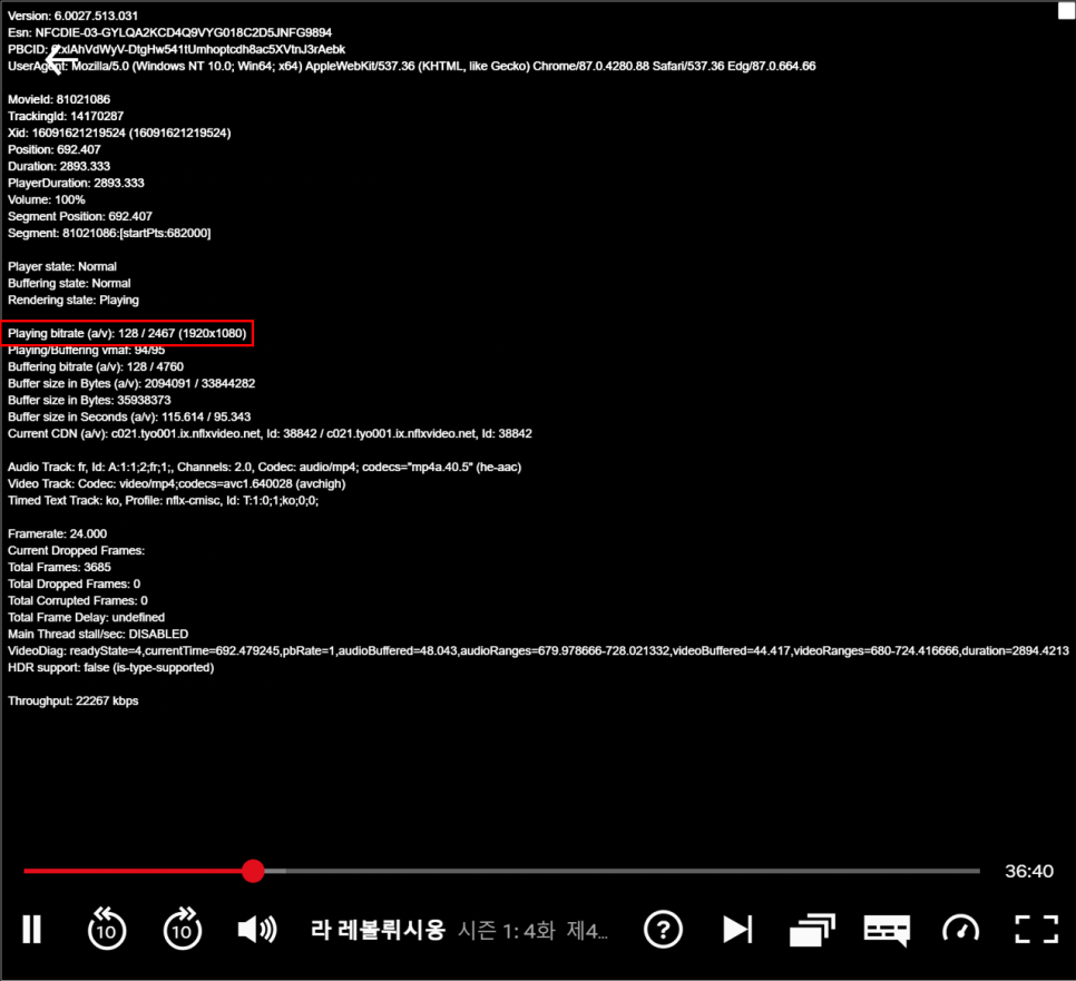 위 화면의 ‘Playing bitrate(a/v)’ 항목에서 확인할 수 있습니다.