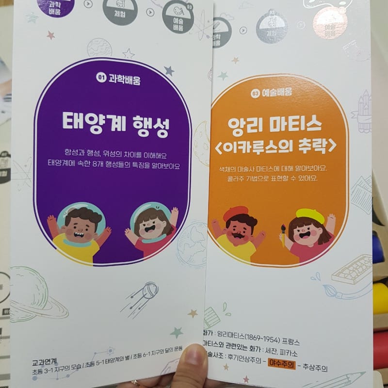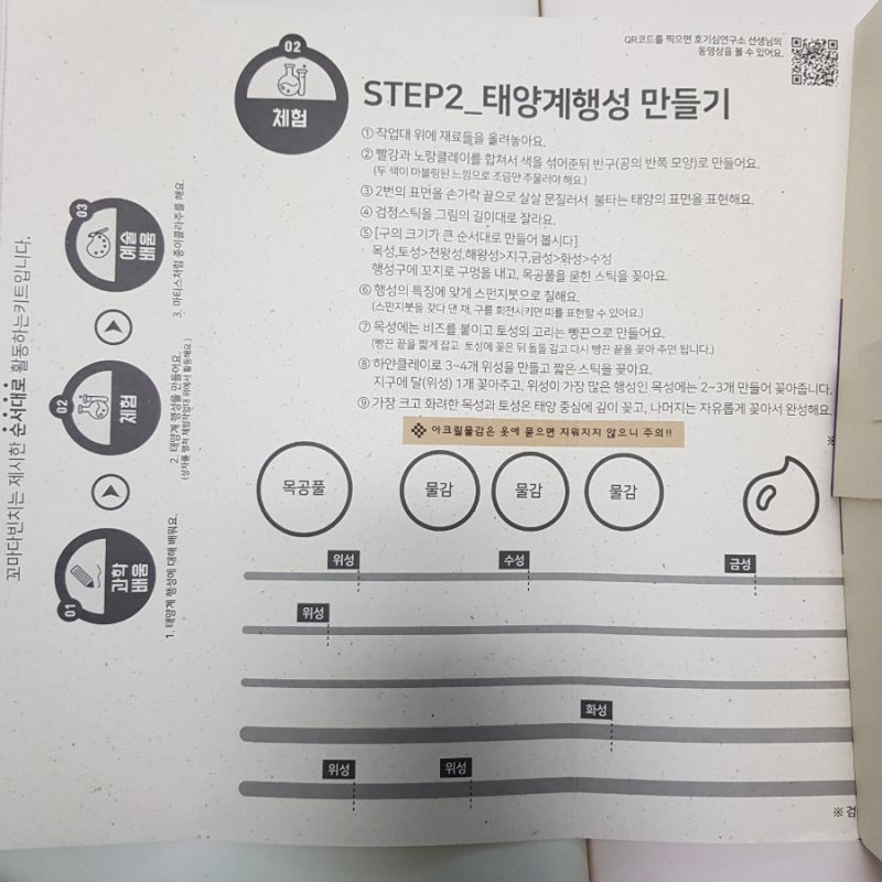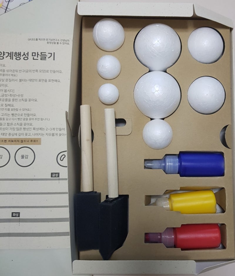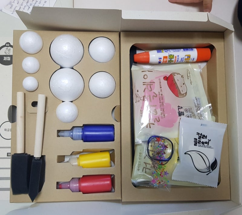 “엄마, 엄마~” “빨리 하고 싶어요”라고 열고 바로 키트 내용을 알아보는 열매입니다.사실 태양계 행성 만들기 키트는 다섯 살짜리 우리 열매가 생기는 건가 싶었고 도저히 두 번째랑 세 번째를 같이 데리고 가는 물감도 있고 못할 것 같아서… 열매만 따로 데리고 진행했습니다.과학을 배우다/예술을 배우는 내용이 있습니다.