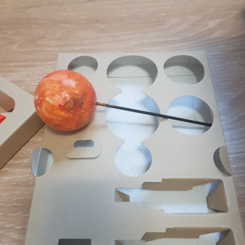 태양계 행성의 재료는 이렇습니다.클레이 50g – 빨강, 노랑 / 클레이 10g – 흑백스틱(5개) / 목공초 / 꼬치 / 물감 – 빨강, 노랑, 파랑 스펀지붓(2개) / 행성도구(8개) / 장식재료 워크지 – 과학, 예술을 펼쳐 봅니다.