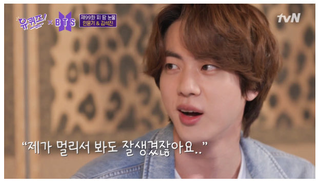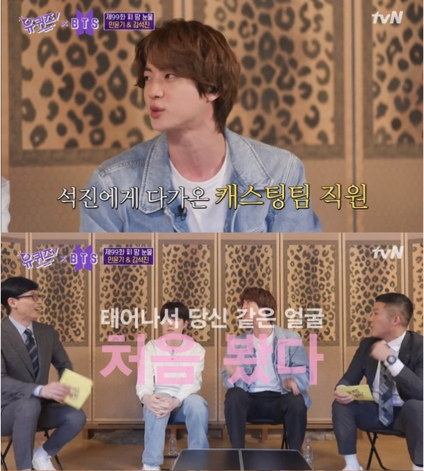 이날 방송에서 유재석이 진에게 소속사에 들어가게 된 과정을 묻자 진은 스무 살 때 대학에 등교 중이었는데 내가 멀리서 봐도 잘생기지 않았나.버스에서 내리려 할 때 캐스팅 팀 직원이 와서 붙잡고 난 생전 처음 당신 같은 얼굴을 봤다고 말해 웃음을 자아냈다.