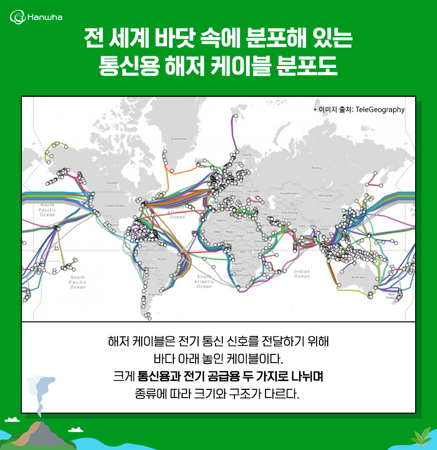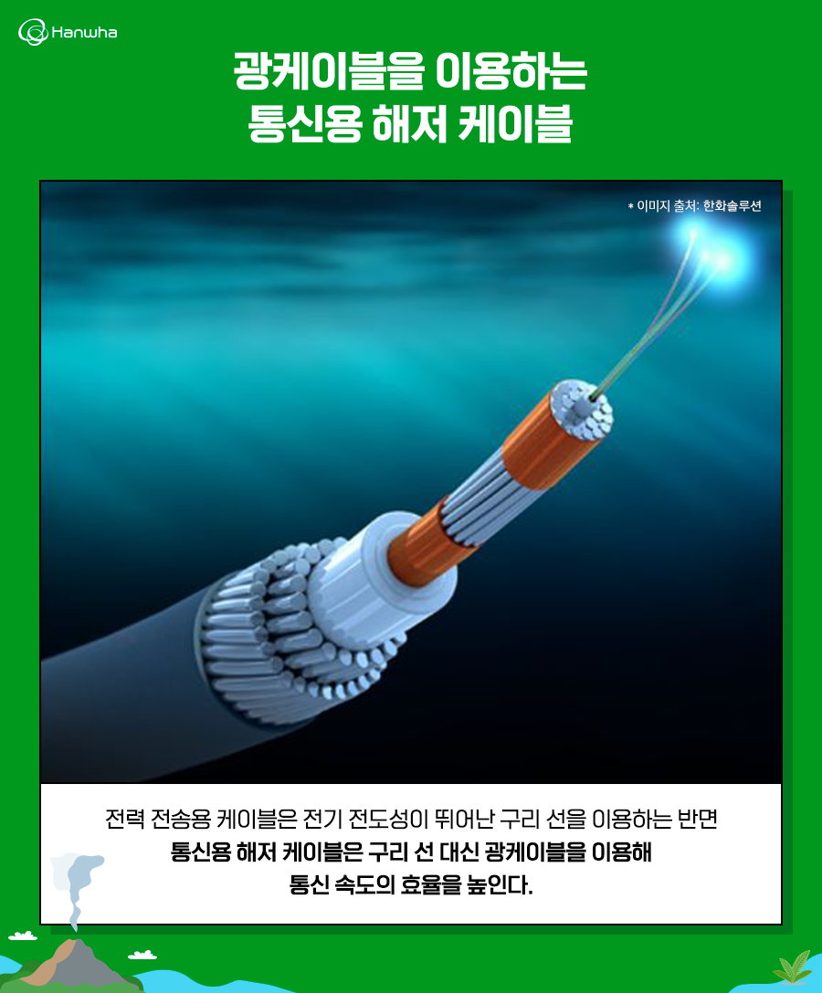 통신용 해저 케이블은 과거에는 전력용 해저 케이블처럼 구리선을 이용하고 있었지만, 속도나 전송량 등의 장점에 따라 광케이블로 이용하게 되었습니다. 광케이블의 가장 안쪽에 광섬유 케이블이 있는데 이를 보호하는 다중 레이어입니다. 또한 부식으로부터 보호하기 위해 폴리에틸렌, 나일론 등 다양한 소재로 쌓아 올려져 있습니다.초고압 케이블 핵심 소재 개발에 성공한 한화솔루션!해저케이블은 예기치 못한 자연재해로 단절된다는 단점도 가지고 있지만, 오늘날 산업전반에 꼭 필요한 장치입니다. 이를 위해 국내에서도 현재 해저케이블을 제작하고 있습니다. 그러나 그동안 국내 해저케이블은 제작에 사용되는 소재의 대부분을 수입에 의존하고 있어 아쉬움을 남겨 왔습니다.