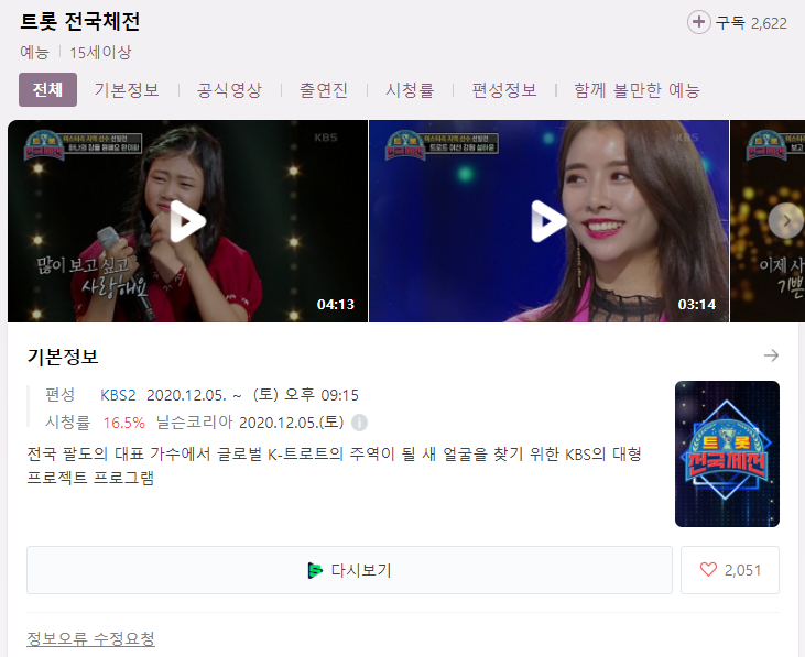 시청률 조사업체 닐슨코리아에 따르면 지난 26일 오후 방송된 KBS 2TV 트로트 전국체전은 1부는 13.1%, 2부는 13.6%의 전국 일일 시청률을 기록했다고 합니다.이날 동시간대에 방영한 지상파 프로그램 중 가장 높은 수치라면서요~~~ 그만큼 인기 있는 핫한 프로그램이네요!