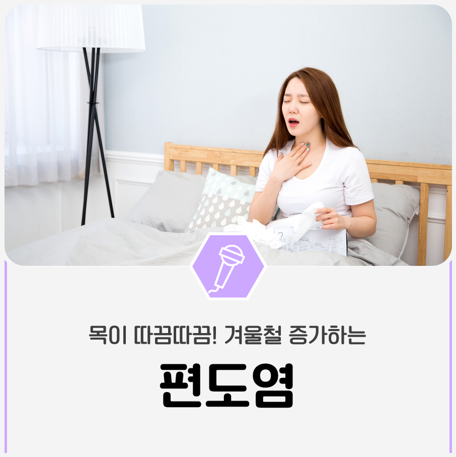 수술적 치료로는 편도절제술이 있습니다. 편도 절제술은 재발성 편도염에서 가장 일반적으로 시행이 됩니다. 다른 치료법을 충분히 시도했음에도 불구하고 3~4회 이상 편도선염이 재발한 경우 편도절제술을 시행할 수 있습니다. 편도선 비대로 인해 치아의 부정교합이나 안면골 발달 장애가 생긴 경우에도 수술을 권장합니다.편도염에 좋은 음식●무 : 씹으면 편도선이 부었을 때나 목에 가래가 자주 끼는 분들에게 좋은 식품으로 편도염이 있을 때 무꿀차, 무즙을 만들어 섭취하는 것이 좋다고 합니다.● 배 : 편도선이 부어 있을 때의 붓기와 열을 진정시키고 피로 해소를 돕는 아미노산, 비타민, 유기산 등의 성분이 풍부하여 면역 기능을 강화합니다.● 매실 : 매실의 경우, 신진대사를 촉진시키는 해독작용이 있어 편도선이 부어 있을 때 진정시킬 수 있습니다.지금까지 편도염에 대해 알아봤습니다.갑자기 추워진 날씨에 놀라신 분들도 많이 계시겠지만!이럴 때일수록 몸 관리를 철저히 해야 합니다.편도염에 유의하여 건강한 겨울 보내세요!출처 국민건강지식센터 http://hqcenter.snu.ac.kr/archives/jiphyunjeon/%EC%84%9C%EB%8A%98%ED%95%9C-%EC%95%84%EC%B9%A8-%EC%A0%80%EB%85%81-%ED%99%98%EC%A0%88%EA%B8%B0-%ED%8E%B8%EB%8F%84%EC%97%BC-%EC%A3%BC%EC%9D%98 서울대병원 http://www.snuh.org/health/nMedInfo/nView.do?category=DIS&medid=AA000165 삼성서울병원 http://www.samsunghospital.com/home/healthInfo/content/contenView.do?CONT_SRC_ID=32226 & CONT _ SRC = HOMEPAGE & CONT _ ID = 7070 & CONT _ CLS _ CD = 001027