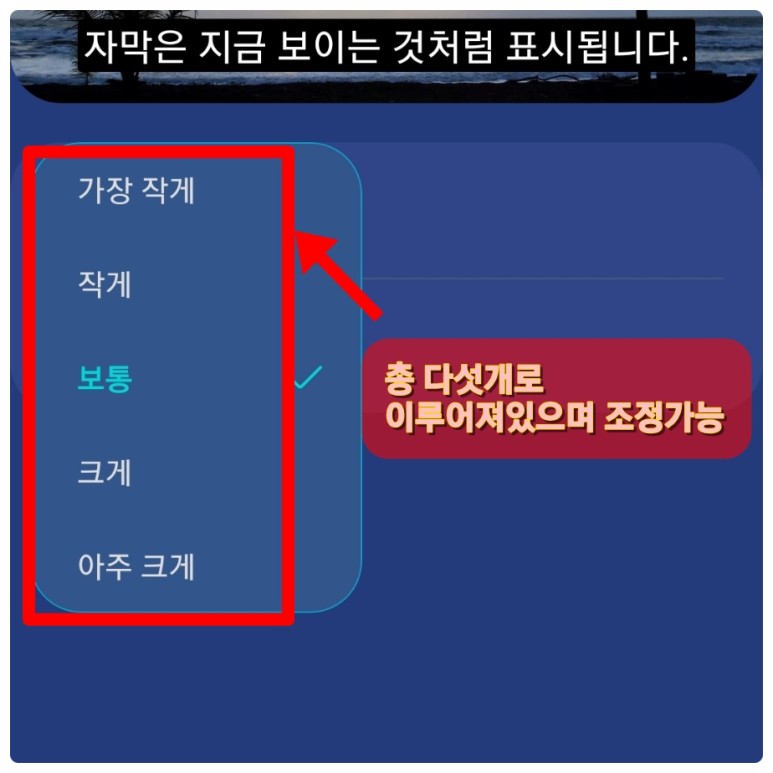 크기는 5가지로 나누어져 있으며 베이직한 상태로 ‘보통’으로 체크되어 있으나 원클릭으로 바로 변환이 가능합니다. 원하는 넷플릭스 자막 크기로 조절해 보세요.