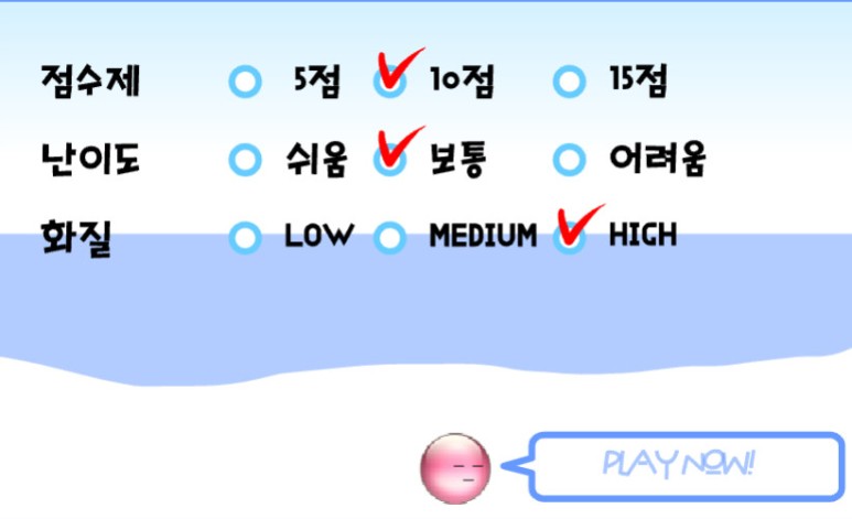 아직 설정할 게 많이 남았어요 점수제를 선택할 수 있고 난이도도 선택할 수 있습니다. 특히 화질은, 가장 높은 것으로 해 두는 것이 모든 디자인의 테두리가 부드러워집니다.