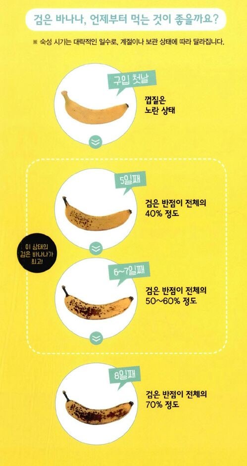 검은 반점이 바나나가 숙성했다는 증거! 원래 영양은 풍부하지만 숙성을 거치면 영양가 높아집니다.