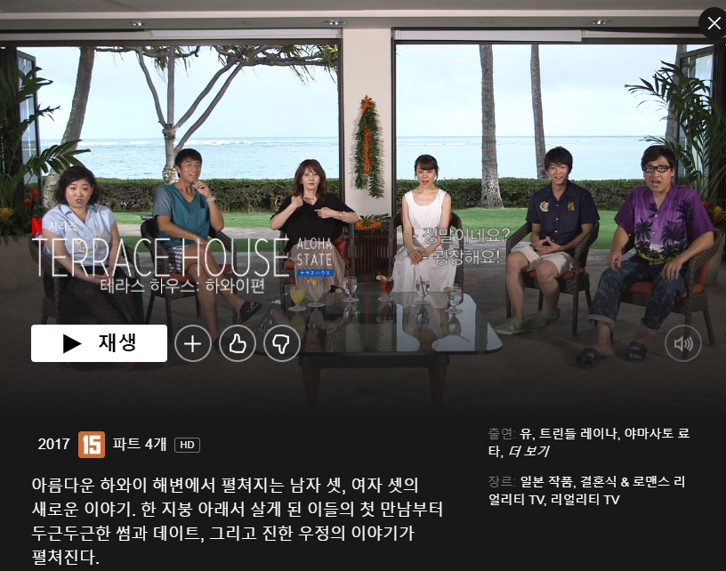 다시 돌아온 넷플릭스 리뷰 시간입니다!테라스하우스 하와이편으로 찾아뵙게 되었습니다.얼마전에 새로운 시작편과 도시남녀편을 리뷰했는데 마지막 하와이편이에요.원래 러브인 도쿄편인데, 이건 출연자 중 한 명이 극단적인 선택을 해서 중간에 끝나고 한국에선 발매를 안 했어요. ㅠㅠ하지만 혹시 모르니까 우회해 볼까 하고 패스를 했습니다