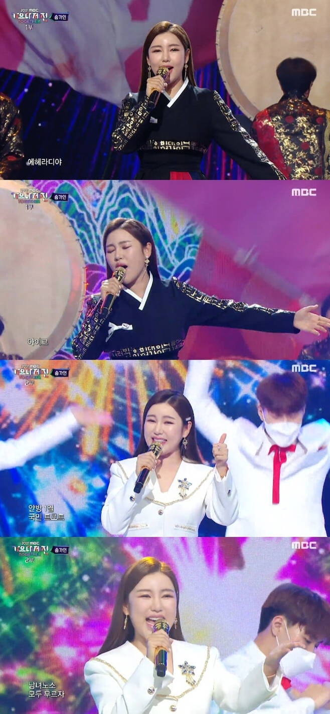▲영상보기/사진=mbc송가인이 연말 시상식에서 한 해를 화려하게 마무리했다.송가인은 지난달 31일 오후 8시 40분부터 생방송으로 방송된 2021 MBC 가요대제전에 출연해 2020년 12월 발매한 2집 꿈과 트로트가 나오는 좋아를 선보여 눈길을 압도했다.송가인은 각 무대에서 다양한 매력으로 보는 이들을 단번에 사로잡았다. 먼저 1부에선 꿈의 무대를 선보였다. 송가인은 사물놀이단과 함께 무대에서 낯익은 재미로 눈과 귀를 즐겁게 했고 에헤라디야라는 가사로 중독성을 높였다. 이어 2부에서는 트로트가 나는 좋아로 유쾌한 에너지를 발산해 흥겨운 무대로 연말 분위기를 고조시켰다.방송 마지막에는 신년 인터뷰도 했다. 범띠 송가인은 “호랑이 기운처럼 열심히 해서 좋은 기운이기를 바란다. 화이팅!」이라고 말해, 「올해는 팬 여러분을 만나 노래하고 즐기고 싶다」라고 새해 소망을 전했다.연말 가요무대에서도 독보적 존재감을 드러낸 송가인은 1월 약 13개월 만에 컴백을 예고했다. 송가인의 이번 신곡 ‘망향가’는 2018년 이후 상봉이 이뤄지지 않은 이산가족이나 고향에 돌아갈 수 없는 실향민들의 아픔과 가족에 대한 그리움, 애환을 담은 곡이다.한편 송가인은 2022년도에도 활발한 활동을 계속해 나갈 예정이다.이덕행 기자 [email protected]