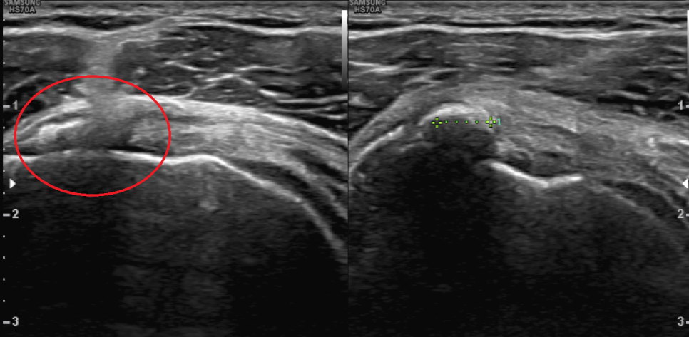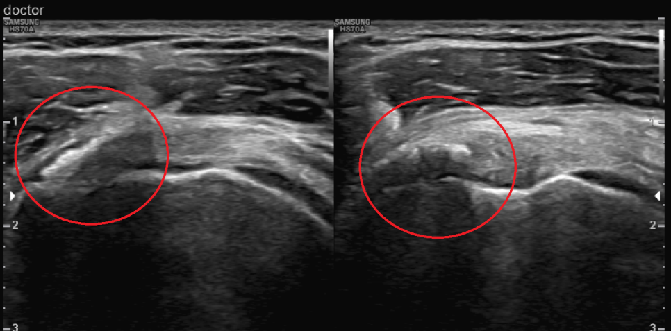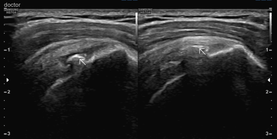 엑스레이와 초음파 검사상 환자의 양 어깨 회전근개(극상근, 견갑하근)에 석회 덩어리가 관찰되어 어깨의 움직임에 많은 제한이 있는 상태에서 관찰되었습니다. 이러한 것들을 석회성 근염이라고 하며, 유착성 피막염이라고 진단을 받게 되었습니다.