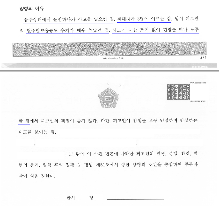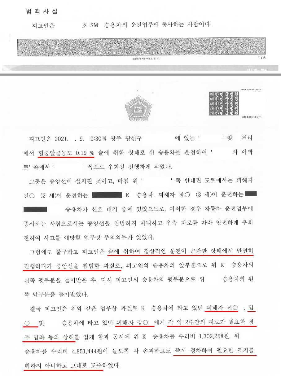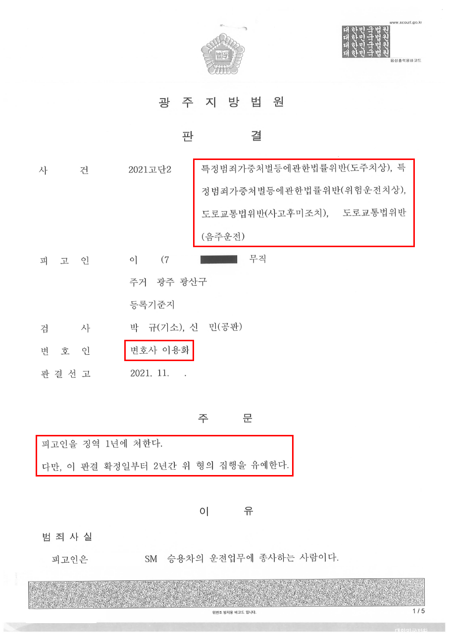 ▣ 판결 결과 (혈중알코올농도 0.19% 만취 상태, 중앙선 침범으로 인피 교통사고 유발, 피해자 3명 모두 전치 2주 상해, 구호조치 없이 도주[뺑소니], 피해자 3명 모두 합의 실패 등 최악의 상황에도 불구하고) 징역 1년, 집행유예 2년
