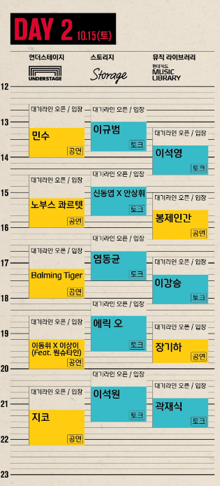 10월 15일 (토) 민수노 부스 콰르텟 Balming Tiger 이동휘x 이상이 (feat. 원스타인) 지코이 규범 신동엽x안상휘염동균 에릭오이석원 이석영 봉제인간 이강 송장장기 하곽재식