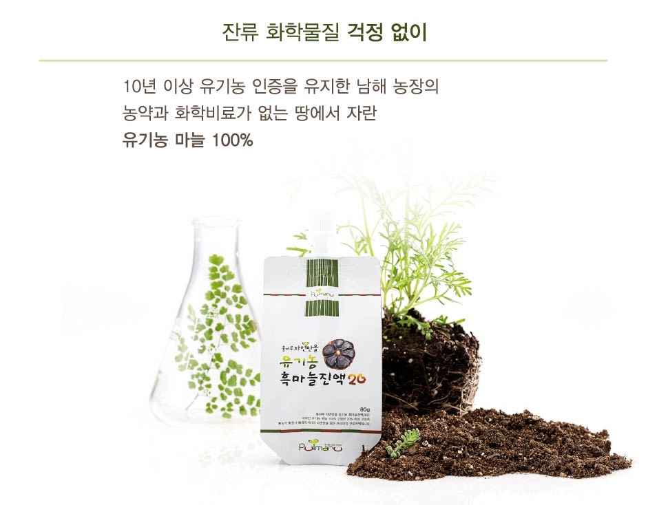 유기농 인증을 10년 넘게 유지한 남해 농장에서 자란 마늘을 쓰기 때문입니다농약이나 화학 비료가 없는 땅에서 자란 유기농 마늘을, 그것도 껍질 그대로 녹인다고 하기 때문입니다.마늘 껍질이 육질에 비해 식이섬유의 함량과 폴리페놀 함량이 훨씬 높다던데 이건 제가 어떻게 먹는 방법도 없어요.저온감압농축으로 성분파괴없이 진하게 들어간 제품이므로 믿고 드셔도 좋습니다.